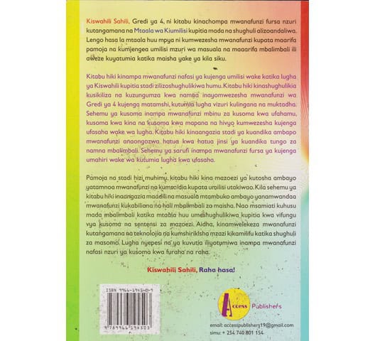 Kiswahili Sahili, Gredi ya 4, ni kitabu kinachompa mwanafunzi fursa nzuri kutangamana na Mtaala wa Kiumilisi kupitia