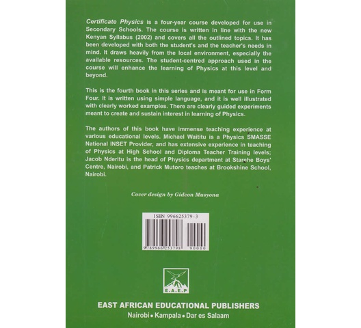Certificate Physics is a four-year course developed for use in Secondary Schools. The course is written in line with the new Kenyan Syllabus (2002) and covers all the outlined topics. It has been developed with both the student’s and the teacher’s needs in mind. It draws heavily from the local environment, especially the available resources. The student-centred approach used in the course will enhance the learning of Physics at this level and beyond.