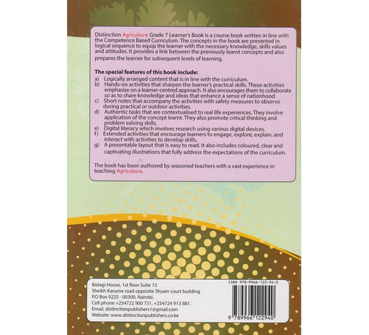 Distinction Agriculture Grade 7 Learner’s Book is a course book written in line with the Competence Based Curriculum. The concepts in the book are presented in logical sequence to equip the learner with the necessary knowledge, skills values and attitudes. It provides a link between the previously learnt concepts and also prepares the learner for subsequent levels of learning.