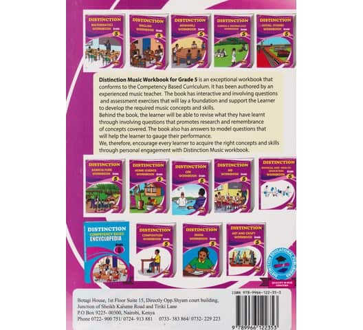 Distinction Music Workbook for Grade 5 is an exceptional workbook that conforms to the Competency Based Curriculum. It has been authored by an experienced music teacher. The book has interactive and involving questions and assessment exercises that will lay a foundation and support the Learner to develop the required music concepts and skills.