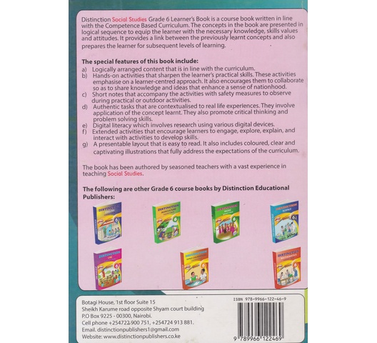 Distinction Social Studies Grade 6 Learner’s Book is a course book written in line with the Competence Based Curriculum. The concepts in the book are presented in logical sequence to equip the learner with the necessary knowledge, skills values and attitudes. It provides a link between the previously learnt concepts and also prepares the learner for subsequent levels of learning.