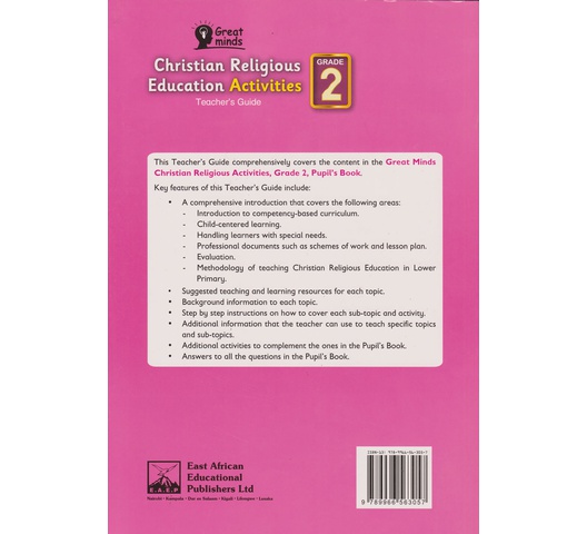 Great Minds CRE Activities GD2, Teachers Book, is a comprehensive course based on the new Competency-Based Curriculum, 2018 for primary schools. This course has been developed to enable learners apply listening, speaking, reading, and writing skills in their daily use of language. This Grade 2 book is presented in a simple manner. Learners at this level will enjoy using it. here, the teacher becomes a facilitator of learning and not simply a source of knowledge.