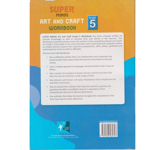 SUPER MINDS Art and Craft Grade 5 Workbook has been uniquely written to provide knowledge as well as develop skills and talents in the learners. The Workbook comprehensively covers the content in the competency-based curriculum for Grade 5. Each book in this series has been well researched and creatively written to enable learners to acquire the required competencies, skills, values, pertinent and contemporary issues as well as attitudes.