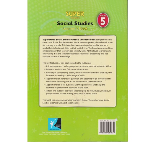Super Minds Social Studies Grade 5 Learner’s Book comprehensively covers the Social Studies content in the new competency based curriculum for primary schools. This book has been developed to enable learners apply their talents and skills to their daily living. The book is presented in a simple manner that learners can identify with. At this level, learners will enjoy using it as the teacher becomes a facilitator of learning and not simply a source of knowledge.