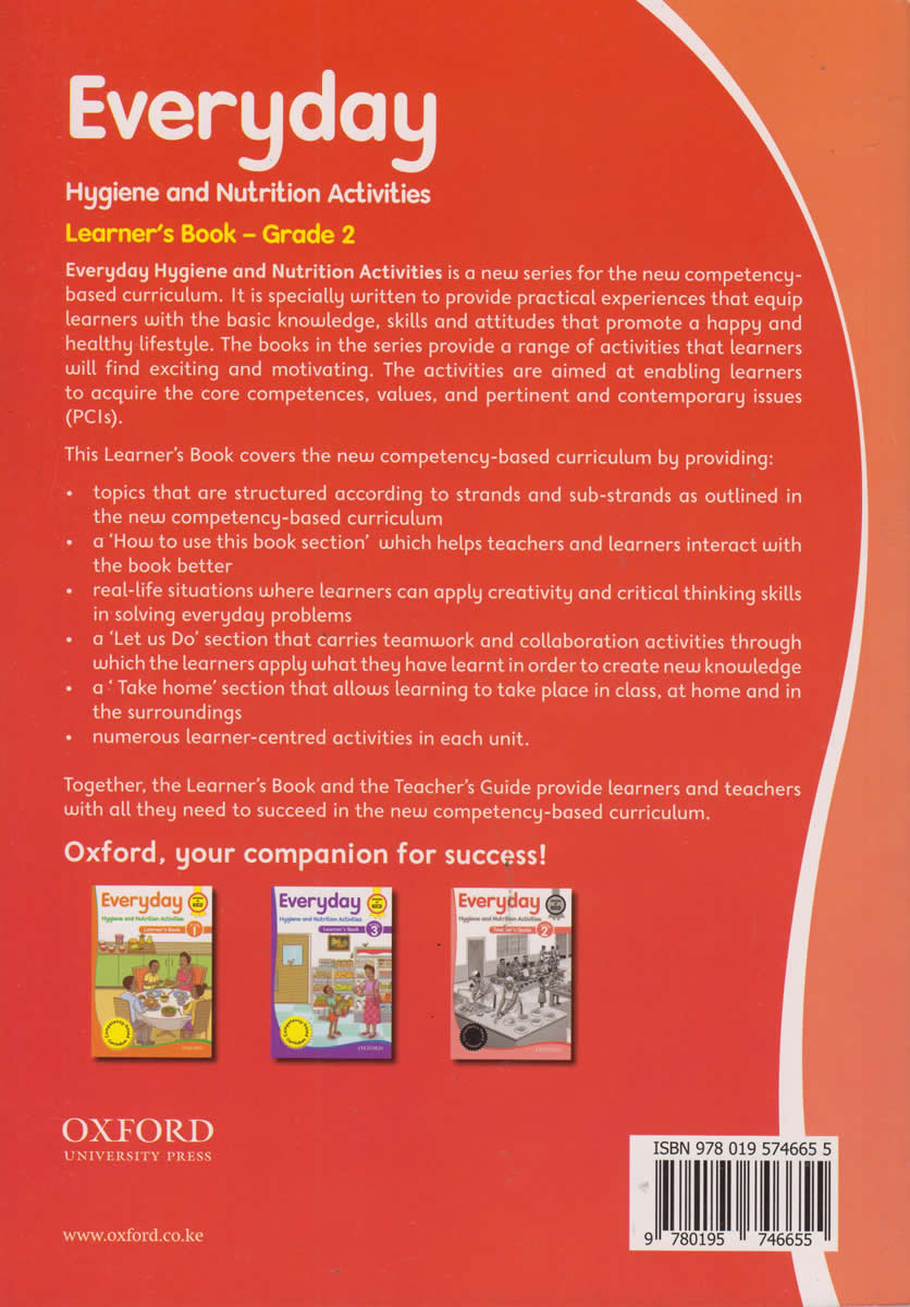 Everyday Hygiene and Nutrition Activities is a new series for the new competency based curriculum, specially written to provide practical experiences that equip learners with the basic knowledge, skills and attitudes that promote a happy and healthy lifestyle. Books in the series provide a range of activities that learners will find exciting and motivating. The activities are aimed at acquisition of the core competences, values and pertinent and contemporary issues (PCIs).