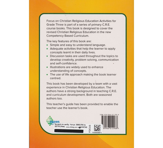 Focus on Christian Religious Education Activities for Grade Three is part of a series of primary C.R.E. course books. This book is designed to cover the revised Christian Religious Education in the new Competency Based Curriculum.