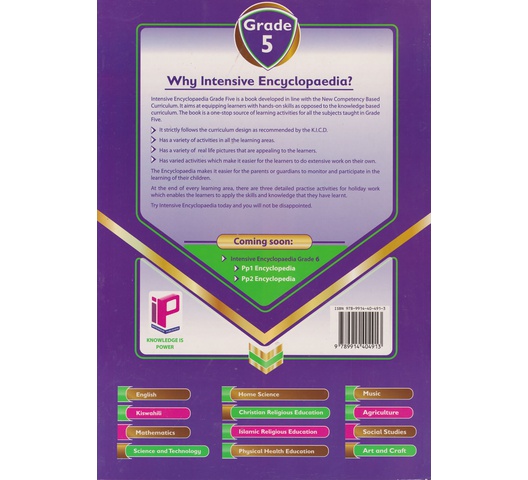 Intensive Encyclopaedia Grade Five is a book developed in line with the New Competency Based Curriculum. It aims at equipping learners with hands-on skills as opposed to the knowledge based curriculum. The book is a one-stop source of learning activities for all the subjects taught in Grade Five.