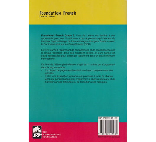 Foundation French Grade 5, Livre de L’élève est destiné à des apprenants précoces. Il s’adresse à des apprenants qui viennent de terminer l’apprentissage du français langue étrangère Grade 4 selon le Curriculum axé sur les compétences (CBC).