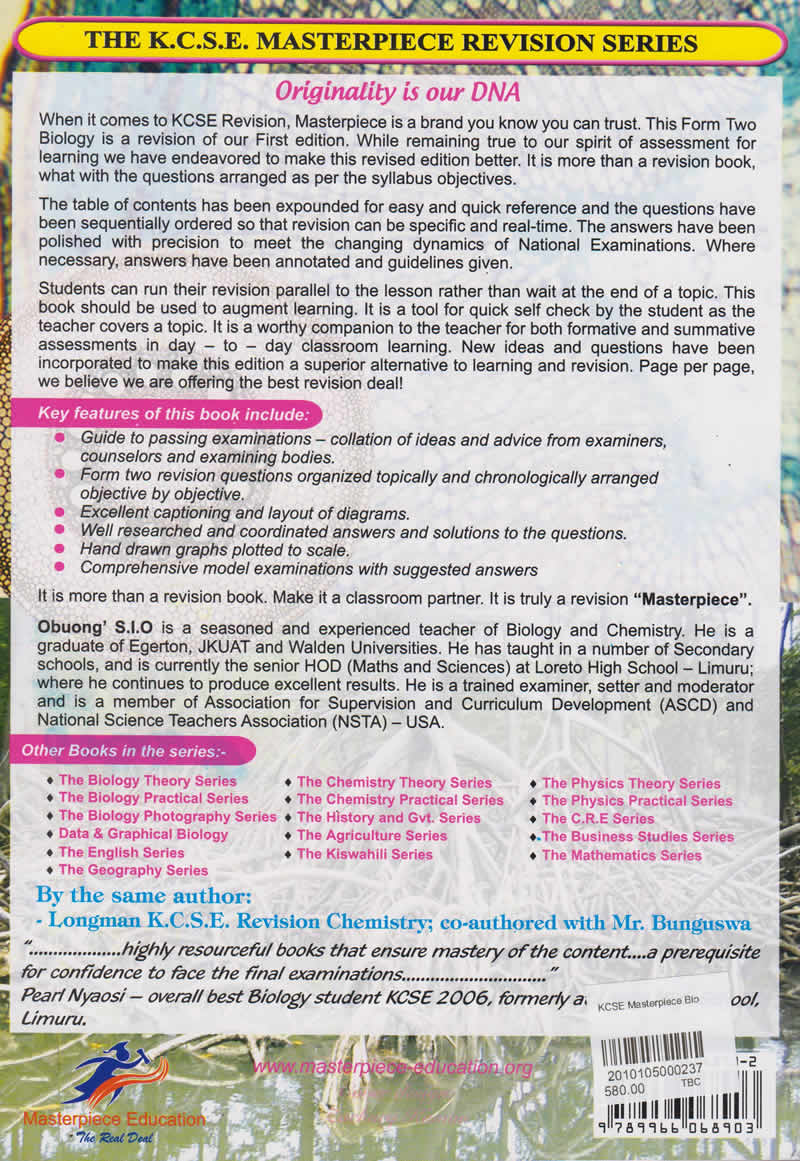 When it comes to KCSE Revision, Masterpiece is a brand you know you can trust. This Form Two Biology is a revision of our First edition. While remaining true to our spirit of assessment for learning we have endeavored to make this revised edition better. It is more than a revision book, what with the questions arranged as per the syllabus objectives. The table of contents has been expounded for easy and quick reference and the questions have been sequentially ordered so that revision can be specific and real-time. The answers have been polished with precision to meet the changing dynamics of National Examinations. Where necessary, answers have been annotated and guidelines given. Students can run their revision parallel to the lesson rather than wait at the end of a topic. This book should be used to augment learning. It Is a tool for quick self check by the student as the teacher covers a topic. It is a worthy companion to the teacher for both formative and summative assessments in day – to – day classroom learning. New ideas and questions have been incorporated to make this edition a superior alternative to learning and revision. Page per page, we believe we are offering the best revision deal!