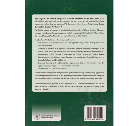 KLB TopScholar Islamic Religious Education Teacher’s Guide for Grade 7 is a self-sufficient book that spells out the outcomes for each strand and sub strand while offering suggestions on how best to teach the IRE Concepts outlined in the Competency Based Curriculum Designs for Grade 7.