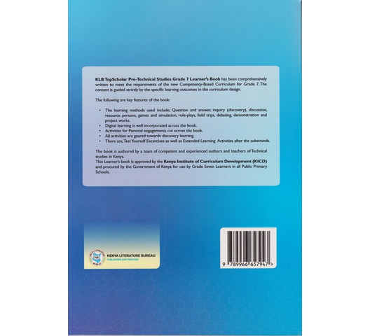 KLB TopScholar Pre-Technical Studies Grade 7 Learner’s Book has been comprehensively written to meet the requirements of the new Competency-Based Curriculum for Grade 7. The content is guided strictly by the specific learning outcomes in the curriculum design.