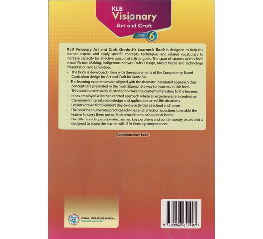 KLB Visionary Art and Craft Grade Six Learner’s Book is designed to help the learner acquire and apply specific concepts, techniques and related vocabulary to increase capacity for effective pursuit of artistic goals. The span of strands at this level entail: Picture Making, Indigenous Kenyan Crafts, Design, Mixed Media and Technology,Presentation and Exhibition.