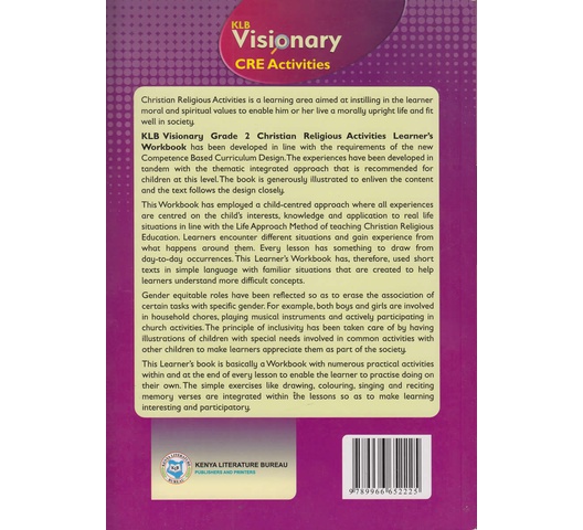 KLB Visionary Grade 2 Christian Religious Activities Learner’s Workbook has been developed in line with the requirements of the new Competence Based Curriculum Design.The experiences have been developed in tandem with the thematic integrated approach that is recommended for children at this level.The book is generously illustrated to enliven the content and the text follows the design closely. This Workbook has employed a child-centred approach where all experiences are centred on the child’s interests, knowledge and application to real life situations in line with the Life Approach Method of teaching Christian Religious Education. Learners encounter different situations and gain experience from what happens around them. Every lesson has something to draw from day-to-day occurrences. This Learner’s Workbook has, therefore, used short texts in simple language with familiar situations that are created to help learners understand more difficult concepts. Gender equitable roles have been reflected so as to erase the association of certain tasks with specific gender. For example, both boys and girls are involved in household chores, playing musical instruments and actively participating in church activities.The principle of inclusivity has been taken care of by having illustrations of children with special needs involved in common activities with other children to make learners appreciate them as part of the society. This Learner’s book is basically a Workbook with numerous practical activities within and at the end of every lesson to enable the learner to practise doing on their own. The simple exercises like drawing, colouring, singing and reciting memory verses are integrated within the lessons so as to make learning interesting and participatory.