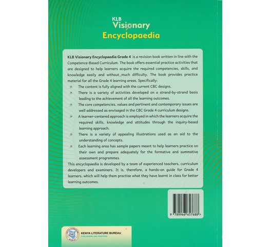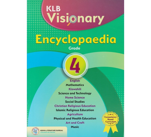 KLB Visionary Encyclopaedia Grade 4 is a revision book written inline with the Competence-Based Curriculum. The book offers essential practice activities that are designed to help learners acquire the required competencies, skills, and knowledge easily and without, much difficulty. The book provides practice material for all the Grade 4 learning areas. Specifically: