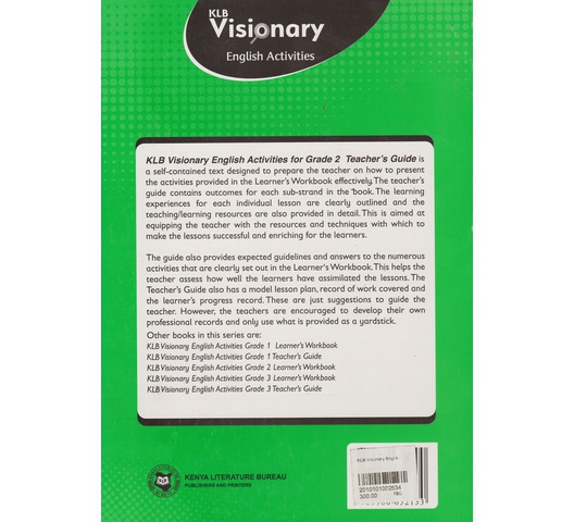 KLB Visionary English Activities for Grade 2 Teacher’s Guide is a self-contained text designed to prepare the teacher on how to present the activities provided in the Learner’s Workbook effectively. The teacher’s guide contains outcomes for each sub-strand in the book. The learning experiences for each individual lesson are clearly outlined and the teaching/learning resources are also provided in detail. This is aimed at equipping the teacher with the resources and techniques with which to make the lessons successful and enriching for the learners.