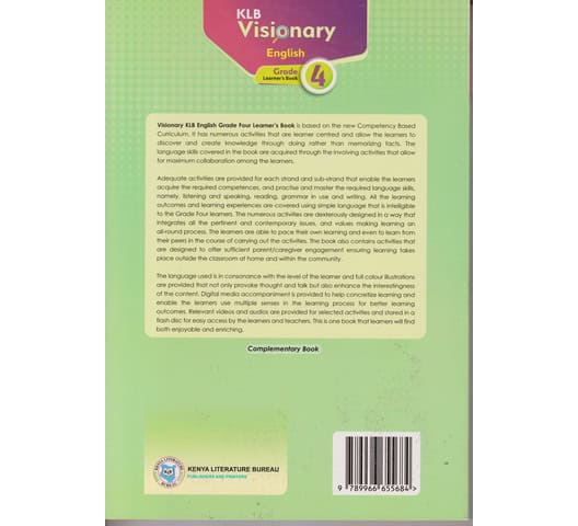 Visionary KLB English Grade Four Learner’s Book is based on the new Competency Based Curriculum. It has numerous activities that are learner centred and allow the learners to discover and create knowledge through doing rather than memorizing facts. The language skills covered in the book are acquired through the involving activities that allow for maximum collaboration among the learners.