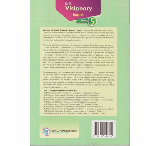 Visionary KLB English Grade Five Learner’s Book is based on the new Competency-Based Curriculum. It has numerous activities that are learner-centered and allow the learners to discover and create knowledge through doing rather than memorizing facts. The language skills covered in the book are acquired through the involving activities that allow for maximum collaboration among the learners.