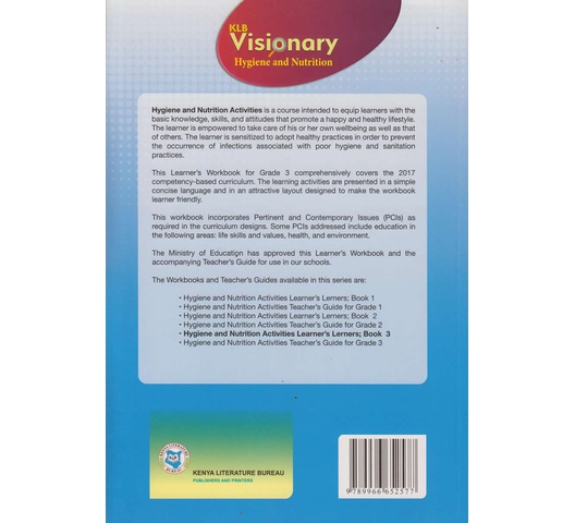 Hygiene and Nutrition Activities is a course intended to equip learners with the basic knowledge, skills. and attitudes that promote a happy and healthy lifestyle. The learner is empowered to take care of his or her own wellbeing as well as that of others. The learner is sensitized to adopt healthy practices in order to prevent the occurrence of infections associated with poor hygiene and sanitation practices. This Learner’s Workbook for Grade 3 comprehensively covers the 2017 competency-based curriculum. The learning activities are presented in a simple concise language and in an attractive layout designed to make the workbook learner friendly. This workbook incorporates Pertinent and Contemporary Issues (PCIs) as required in the curriculum designs. Some PCIs addressed include education in the following areas: life skills and values, health, and environment.