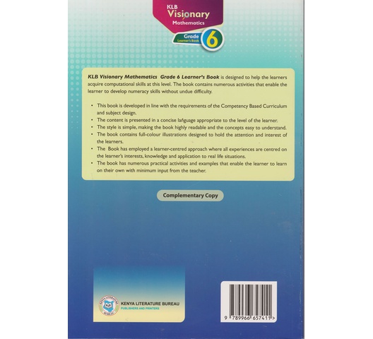 KLB Visionary Mathematics Grade 6 Learner’s Book is designed to help the learners acquire computational skills at this level. The book contains numerous activities that enable the learner to develop numeracy skills without undue difficulty.
