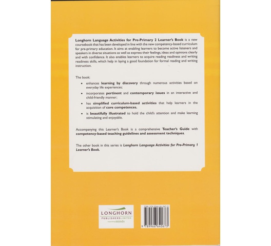 Longhorn Language Activities for Pre-Primary 2 Learner’s Book is a new coursebook that has been developed in line with the new competency-based curriculum for pre-primary education. It aims at enabling learners to become active listeners and speakers in diverse situations as well as express their feelings, ideas and opinions clearly and with confidence. It also enables learners to acquire reading readiness and writing readiness skills, which help in laying a good foundation for formal reading and writing instruction.