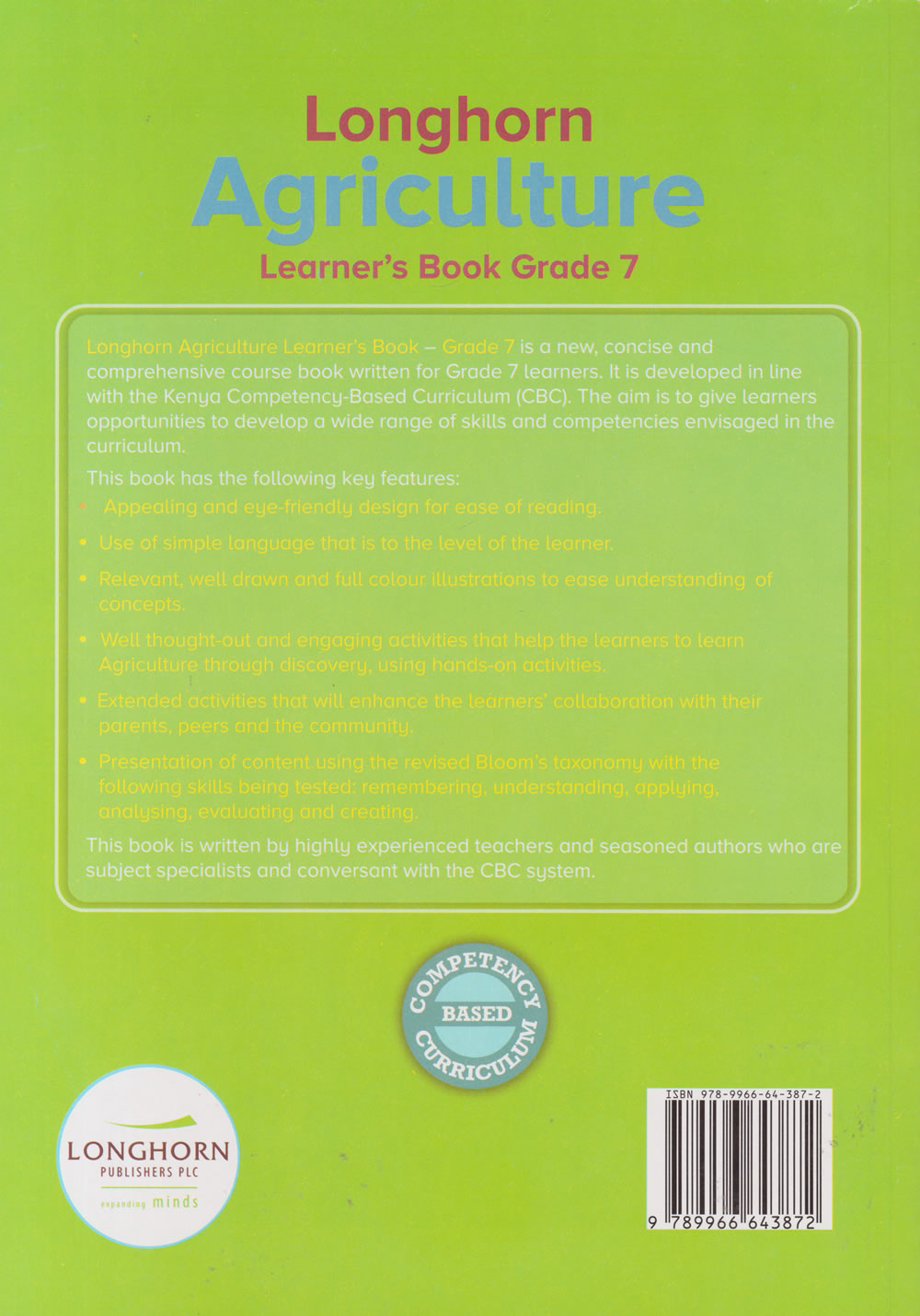 Longhorn Agriculture Learner’s Book-Grade 7 is a new, concise and comprehensive course book written for Grade 7 learners. It is developed in line with the Kenya Competency-Based Curriculum (CBC). The aim is to give learners opportunities to develop a wide range of skills and competencies envisaged in the curriculum.