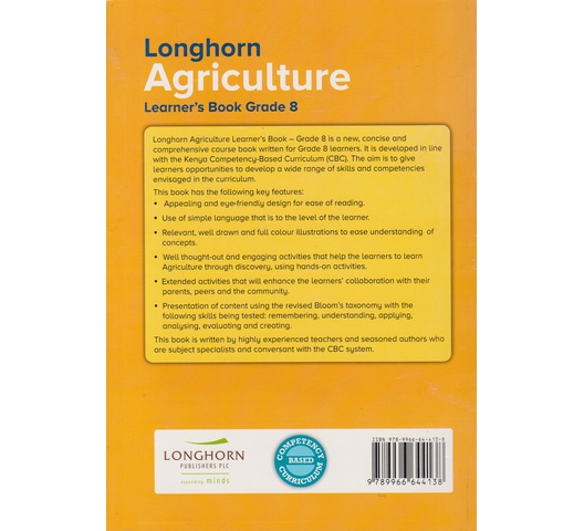Longhorn Agriculture Learner’s Book Grade 8 is a new, concise and comprehensive course book written for Grade 8 learners. It is developed in line with the Kenya Competency-Based Curriculum (CBC). The aim is to give learners opportunities to develop a wide range of skills and competencies envisaged in the curriculum.