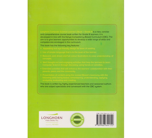 Longhorn Computer Science Learners Book is a new, concise and comprehensive course book written for Grade 8 learners. It is developed in line with the Kenya Competency-Based Curriculum (CBC). The aim is to give learners opportunities to develop a wide range of skills and competencies envisaged in the curriculum.