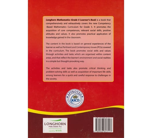 Longhorn Mathematics Grade 5 Learner’s Book is a book that comprehensively and exhaustively covers the new Competency-Based Mathematics Curriculum for Grade 5. It promotes the acquisition of core competences, relevant social skills, positive attitudes, and values. It also promotes the practical application of knowledge gained in the classroom.