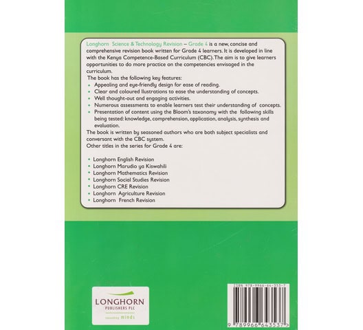 Longhorn Science & Technology Revision — Grade 4 is a new, concise and comprehensive revision book written for Grade 4 learners. It is developed in line with the Kenya Competence-Based Curriculum (CBC). The aim is to give learners opportunities to do more practice on the competencies envisaged in the curriculum.