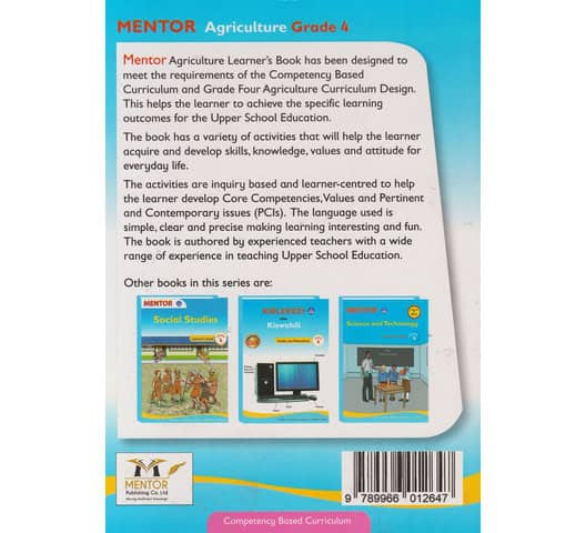 Mentor Agriculture Learner’s Book has been designed to meet the requirements of the Competency Based Curriculum and Grade Four Agriculture Curriculum Design. This helps the learner to achieve the specific learning outcomes for the Upper School Education.