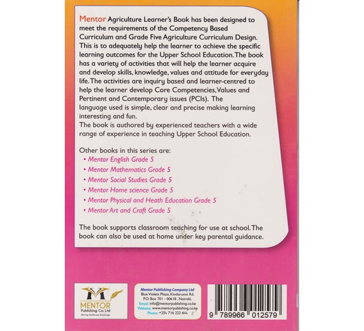 Mentor Agriculture Learner’s Book has been designed to meet the requirements of the Competency-Based Curriculum and Grade Five Agriculture Curriculum Design. This is to adequately help the learner to achieve the specific learning outcomes for the Upper School Education. The book has a variety of activities that will help the learner acquire and develop skills, knowledge, values, and attitude for everyday life. The activities are inquiry-based and learner-centered to help the learner develop Core Competencies, Values, and Pertinent and Contemporary issues (PCls). The language used is simple, clear, and precise making learning interesting and fun. The book is authored by experienced teachers with a wide range of experience in teaching Upper School Education.
