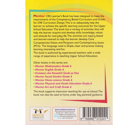 Mentor CRE Learner’s Book has been designed to meet the requirements of the Competency Based Curriculum and Grade Six CRE Curriculum Design. This is to adequately help the learner to achieve the specific learning outcomes for the Upper School Education. The book has a variety of activities that will help the learner acquire and develop skills, knowledge, values and attitude for everyday life. The activities are inquiry based and learner-centred to help the learner develop Core Competencies, Values and Pertinent and Contemporary issues(PCls). The language used is simple, clear and precise making learning interesting and fun.