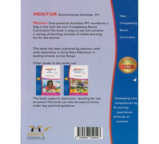 Mentor Environmental Activities PP1 workbook is fully in line with the new Competency-Based Curriculum. The book is easy to use and contains a variety of learning activities. It makes learning fun for the learner.