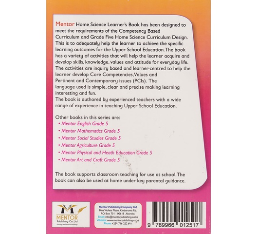 Mentor Home Science Learner’s Book has been designed to meet the requirements of the Competency-Based Curriculum and Grade Five Home Science Curriculum Design. This is to adequately help the learner to achieve the specific learning outcomes for the Upper School Education. The book has a variety of activities that will help the learner acquire and develop skills, knowledge, values, and attitude for everyday life. The activities are inquiry-based and learner-centered to help the learner develop Core Competencies, Values, and Pertinent and Contemporary issues (PCIs). The language used is simple, clear and precise making learning interesting and fun. The book is authored by experienced teachers with a wide range of experience in teaching Upper School Education.