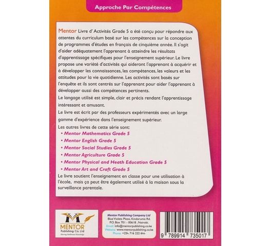 Mentor Livre d’ Activités Grade 5 a été congu pour répondre aux attentes du curriculum basé sur les compétences sur la conception de programmes d’études en frangais de cinquiéme année. Il s‘agit d’aider adéquatement l’apprenant 4 atteindre les résultats d’apprentissage spécifiques pour l’enseignement supérieur. Le livre propose une variété d’activités qui aideront l’‘apprenant 4 acquérir et a développer les connaissances, les compétences, les valeurs et les attitudes pour la vie quotidienne. Les activités sont basés sur ‘enquéte et ils sont centrés sur l’apprenant pour aider l’apprenant 4 développer aussi des compétences pertinents. Le langage utilisé est simple, clair et précis rendant l’apprentissage intéressant et amusant.