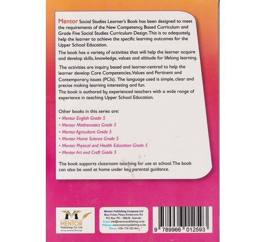 Mentor Social Studies Learner’s Book has been designed to meet the requirements of the New Competency-Based Curriculum and Grade Five Social Studies Curriculum Design. This is to adequately help the learner to achieve the specific learning outcomes for the Upper School Education. The book has a variety of activities that will help the learner acquire and develop skills, knowledge, values, and altitude for lifelong learning.