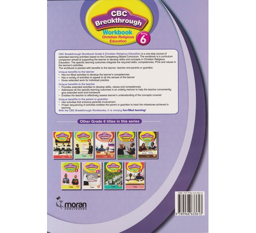 CBC Breakthrough Workbook Grade 6 Christian Religious Education is a one-stop source of extended learning activities based on the Competency Based Curriculum. The workbook is a curriculum companion aimed at supporting the learner to develop skills and concepts in Christian Religious Education. The specific learning outcomes integrate the required skills, competencies, PCls and values in the learner’s activities.The workbook is packed with benefits to the learner, teacher and parents or guardian.