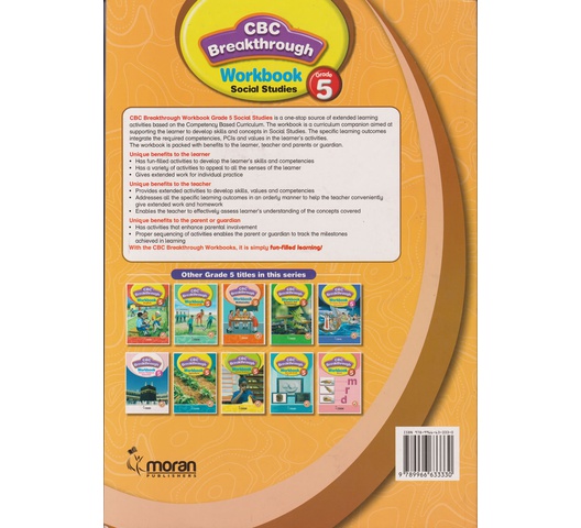 CBC Breakthrough Workbook Grade 5 Social Studies is a one-stop source of extended learning activities based on the Competency Based Curriculum. The workbook is a curriculum companion aimed at supporting the learner to develop skills and concepts in Social Studies. The specific learning outcomes integrate the required competencies, PCis and values in the teamer’s activities.The workbook is packed with benefits to the learner, teacher and parents or guardian.