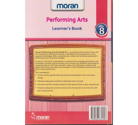 Moran Performing Arts for Grade 8 is a coursebook developed in line with the Competency Based Curriculum. It facilitates the development of the required knowledge, skills, competencies, values and attitudes presented in