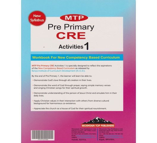 MTP Pre Primary CRE Activities 1 is specially designed to reflect the aspirations of the New Competency-Based Curriculum as released by Kenya Institute of Curriculum Development (K.!.C.D.).