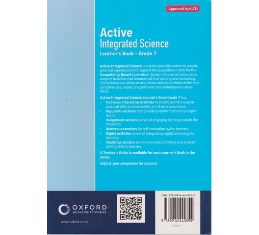 Active Integrated Science is a series specially written to provide practical experiences that support the acquisition of skills for the Competency Based Curriculum. Books in the series have a wide range of activities that learners will find exciting and motivating. The activities are aimed at acquisition and appreciation of the core competencies, values, and pertinent and contemporary issues(PCIs)