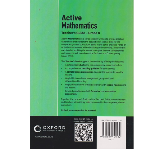 Active Mathematics is a series specially written to provide practical experiences that support the acquisition of science skills for the competency-based curriculum. Books in this series provide a range of activities that learners will find exciting and motivating. The activities are aimed at enabling the learner to acquire the core competencies and values as well as embrace the Pertinent and Contemporary Issues (PCIs).
