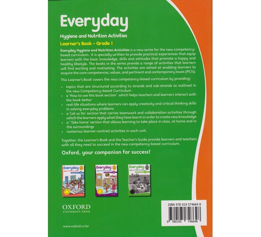 Everyday Hygiene and Nutrition Activities is a new series for the new competency-based curriculum. It is specially written to provide practical experiences that equip learners with the basic knowledge. skills and attitudes that promote a happy and healthy lifestyle. The books in the series provide a range of activities that learners will find exciting and motivating. The activities are aimed at enabling learners to acquire the core competences, values, and pertinent and contemporary issues (PCIs).