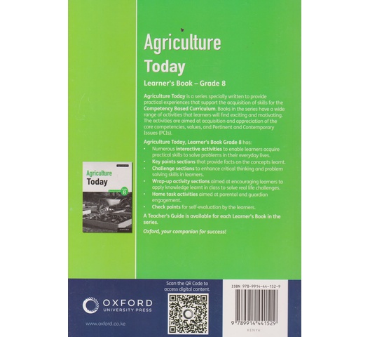 Agriculture Today is a series specially written to provide practical experiences that support the acquisition of skills for the Competency Based Curriculum. Books in the series have a wide range of activities that learners will find exciting and motivating. The activities are aimed at acquisition and appreciation of the core competencies, values, and Pertinent and Contemporary Issues(PCIs)