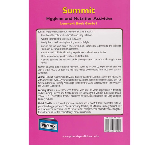 Zilpher Oracha is a renowned SMASE-trained teacher of Science, trainer and facilitator with a wealth of over 30 years’ experience teaching Science in primary schools. She has facilitated several training workshops in the country and participated in the review of the Science Curriculum. She has also authored Summit Revision Science. Zachary Oduri is an experienced teacher with over 15 years’ experience in teaching and examining Science and Mathematics. He has taught in various public and private schools. He is currently a teacher and Head of the Science Panel at the Sony Complex Primary School. He has also authored Summit Revision Science. Violet Nkatha is a trained graduate teacher and a SMASE lead facilitator with 20 years’ teaching experience. She is currently teaching at Milimani Primary School. Her vast experience in Drama and Music activities complement interactive teaching that forms the basis for the competency-based curriculum.