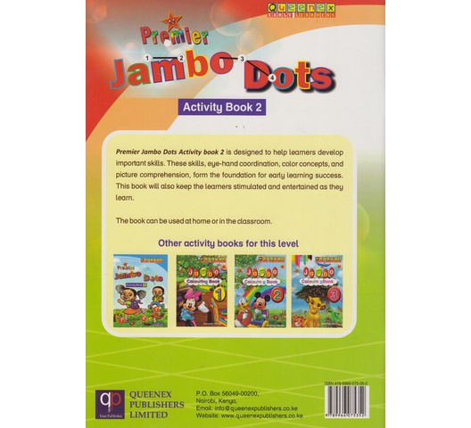 Premier Jambo Dots Activity book 2 is designed to help learners develop important skills. These skills, eye-hand coordination, color concepts, and picture comprehension, form the foundation for early learning success. This book will also keep the learners stimulated and entertained as they learn.