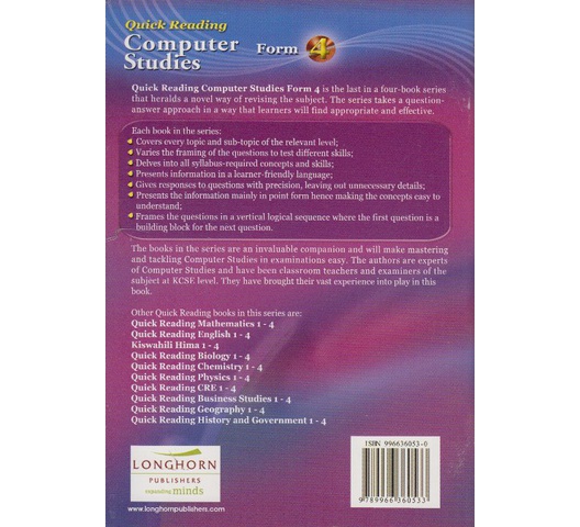 Quick Reading Computer Studies Form 4 is the last in a four-book series that heralds a novel way of revising the subject. The series takes a question-answer approach in a way that learners will find appropriate and effective.Each book in the series: