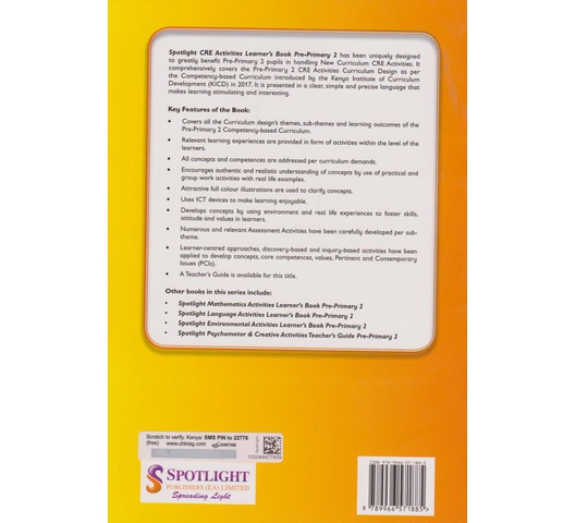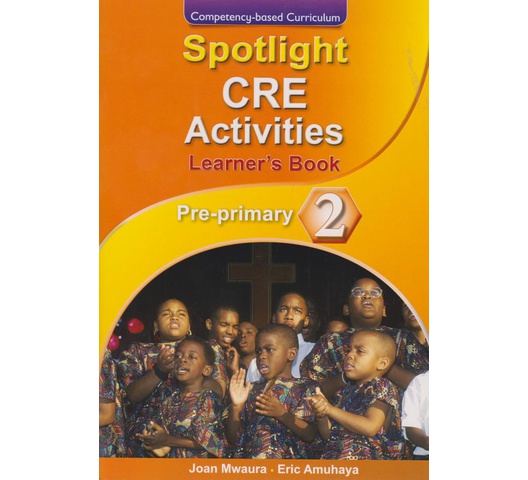 Spotlight CRE Activities Learner’s Book Pre-Primary 2 has been uniquely designed to greatly benefit Pre-Primary 2 pupils in handling New Curricul comprehensively covers the Pre-Primary 2 CRE Activities Curriculum Design as per the Competency-based Curriculum introduced by the Kenya Institute of Curriculum Development (KICD) in 2017. It is presented in a clear, simple, and precise language that makes learning stimulating and interesting.