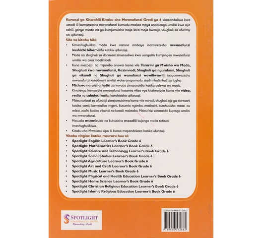 Kurunzi ya Kiswahili Kitabu cha Mwanafunzi Gredi ya 6 kimeandaliwa wa ustadi ili kumwezesha mwanafunzi kumudu mtalaa mpya unaolenga umilisi kwa njia sahili, yenye mvuto na ya kumjumuisha moja kwa moja kwenye shughuli za ufunzaji na ujifunzaji.