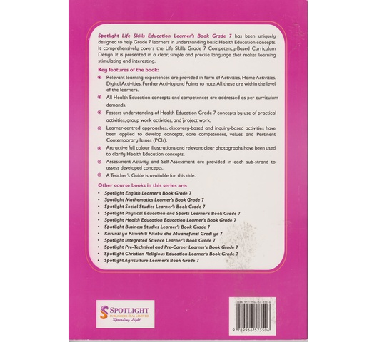 Spotlight Life Skills Education Learner’s Book Grade 7 has been uniquely designed to help Grade 7 learners in understanding basic Health Education concepts. It comprehensively covers the Life Skills Grade 7 Competency-Based Curriculum Design. It is presented in a clear, simple and precise language that makes learning stimulating and interesting.